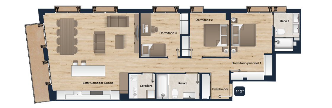La zona de día se compone de salón comedor con cocina de 38 m2 y salida a una amplio balcón, y la zona de noche incluye suite con baño y vestidor, dos habitaciones amplias, un baño completo adicional y cuarto de lavado.